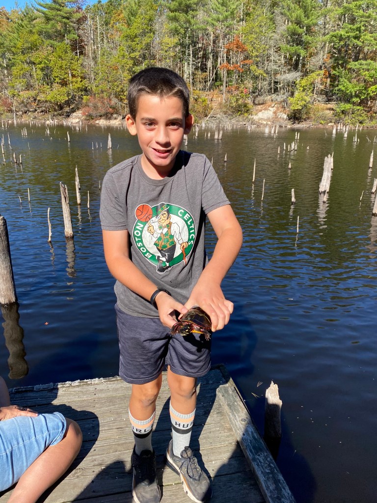 It was a great day to be outside feeding the turtles and the fish and playing with friends at the park. We reversed our work day-though I’m feeling the need for a more constant routine-especially for Logan to work on independence-but we will get there-one day at a time. Other bright spots today were my flowers that just bloomed after taking a year off-they even bloomed on my propogated plant! And lastly-dinner-well this was farm to table with zucchini, summer squash, and kale.