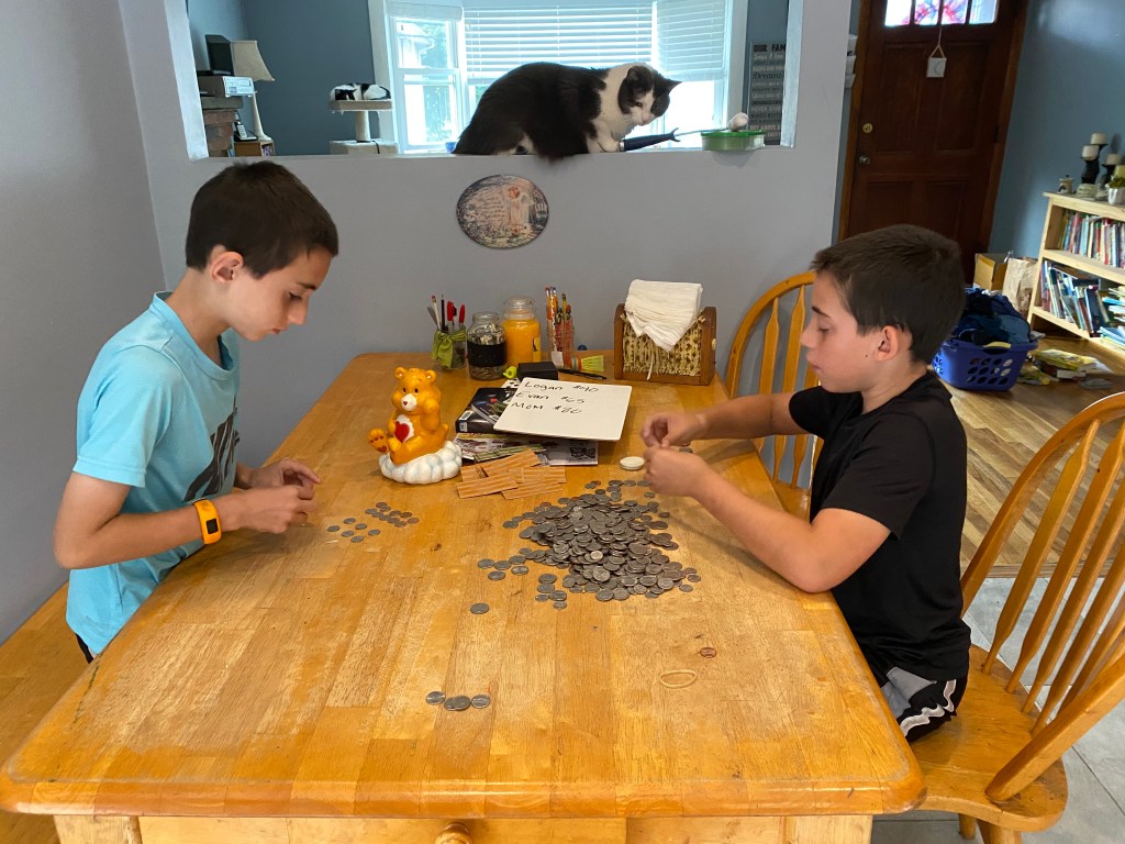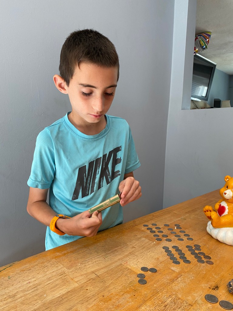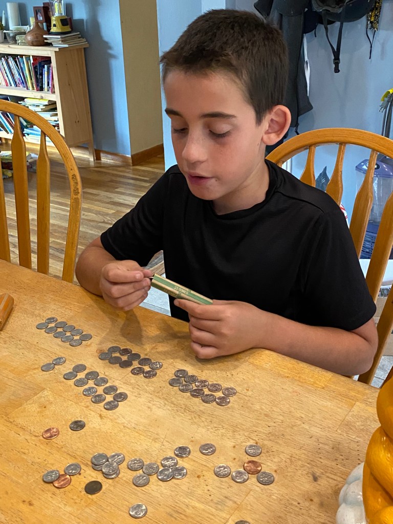 Happy Friday! Today was a successful day of home school. We started out with spelling words and then moved on to a hands on math activity that was also great OT practice as well. We planned to go on a field trip this weekend so we used this opportunity to count and sort change and practice putting it into Coin wrappers. We each made a guess of how much we thought we would have once all of the change was on the table and then figured out how much more we would need if our guess was right. We were very excited to find out that we had $6 more than we needed-this was a successful and fun activity.