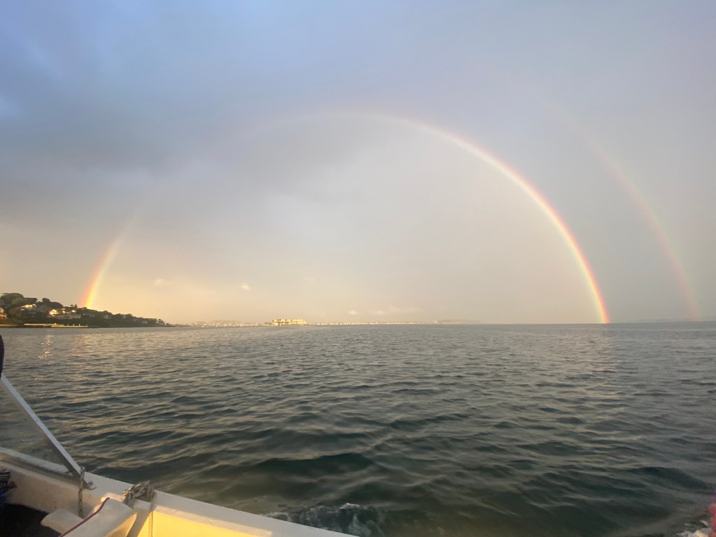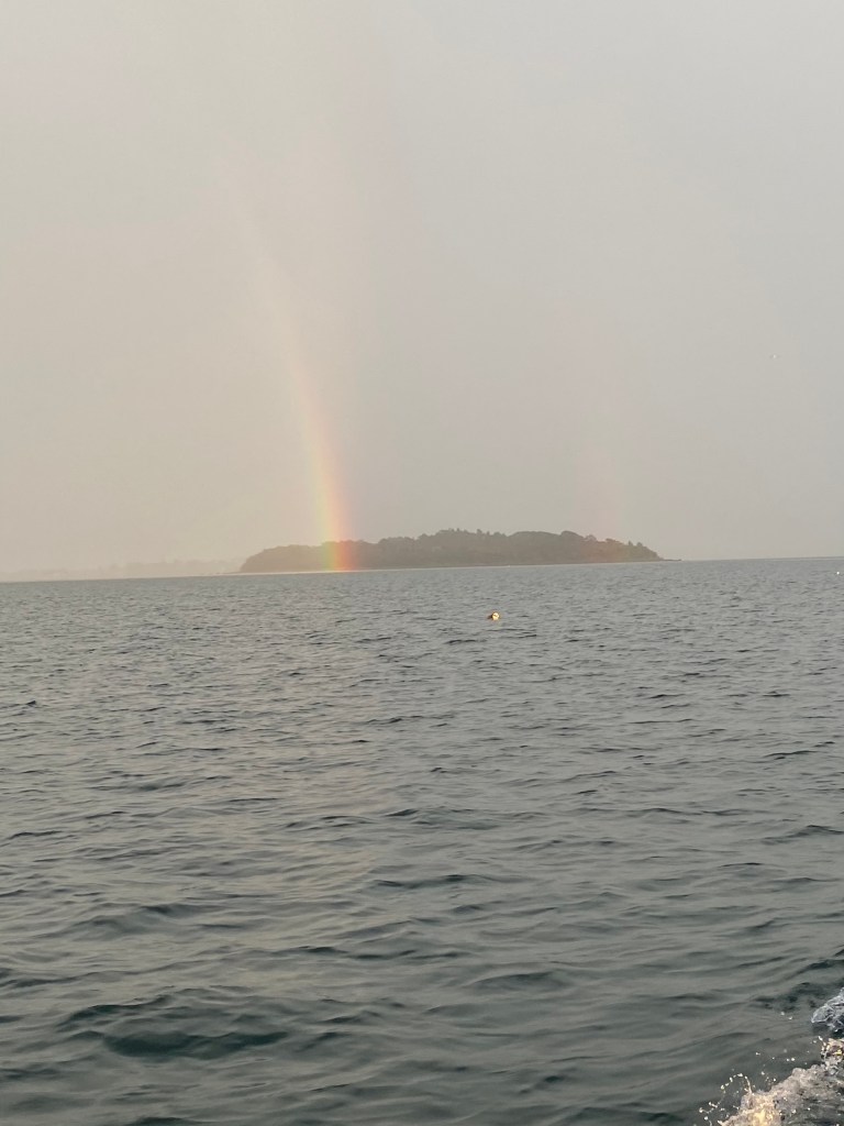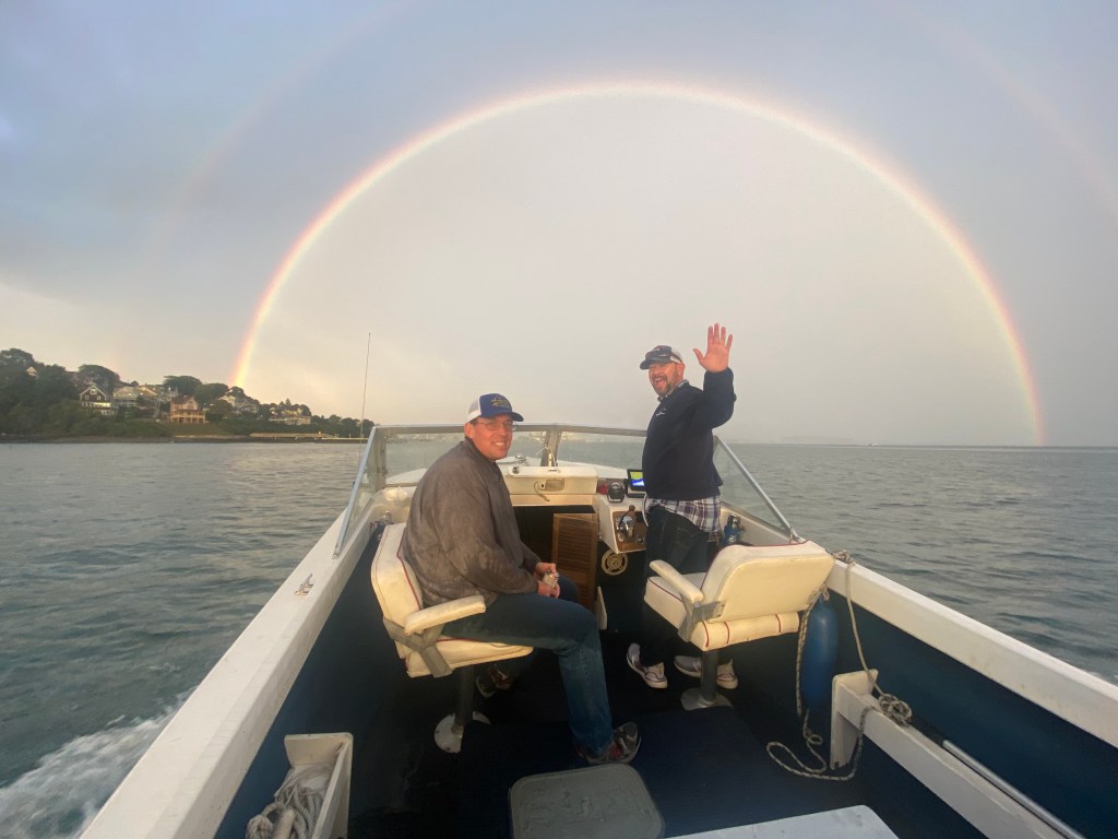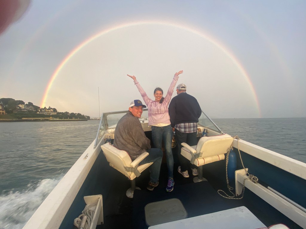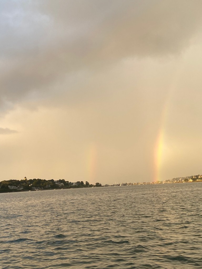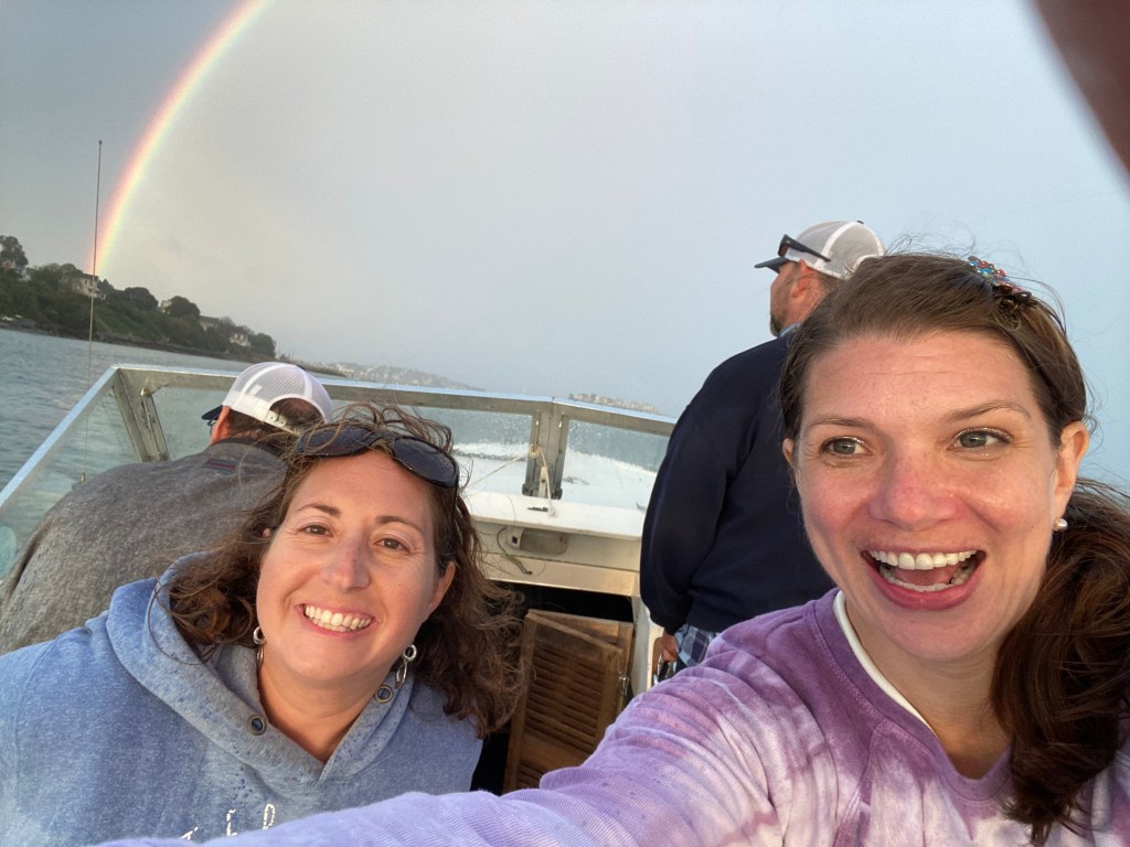I love spending time with friends. Though our weekend was overshadowed by the disappointment of yet another concert being cancelled due to Covid-we decided we should still get together with our friends seeing as we already planned to be kid free for the evening. The rain rolled in on our way to meet our friends at the pier for a boat ride. After the rainy summer we all had-we are tough as nails and were not going to let a little rain ruin our evening. What started as a drizzle turned into downpours. But really, we had the best time with great friends and a fun story to tell for years to come. Sure we looked a mess once we got off the boat-but it was well worth it. The laughs we had won’t soon be forgotten, unlike the pizza that never came at dinner, nor will the amazing double rainbow that appeared right before our eyes-ending right in the ocean.