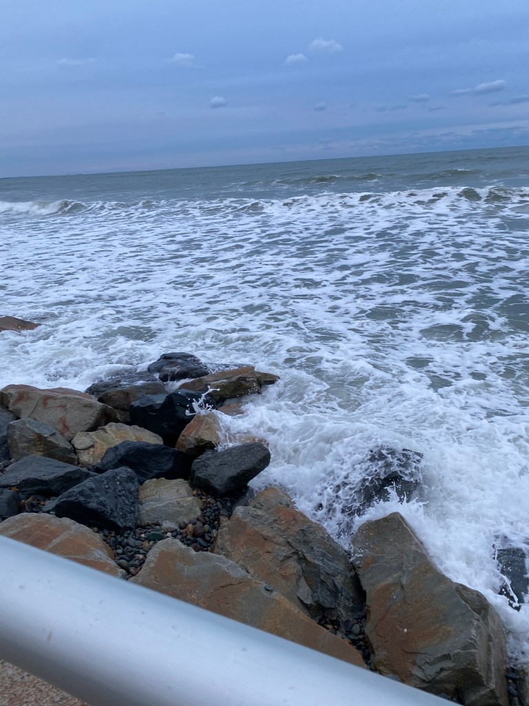 Now that I’m done serenading you, I must admit. Today was a hard day… On autopilot I got the groceries and went to 4 parent teacher conferences. By the time all was said and done and I finally got home to unpack the groceries-I bundled up again to get my pup out for a long walk. As April and I walked along the beach I couldn’t help but notice how the wild water seemed like a metaphor for my life today. Rough seas churning up waves crashing into the rocks on the shore was the perfect picture of how I was feeling inside…