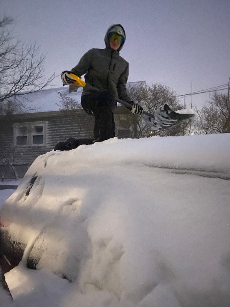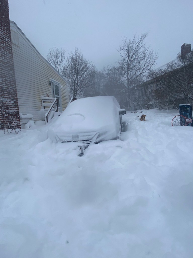 I don’t know about everyone else, but I woke up tired from listening to that wind whipping all night long. 7am came around way too quickly for me. All day I felt like we were biding time and waiting to lose power. I purposely did dishes today rather than loading the dishwasher in case we lost power. At breakfast time I figured, may as well make a big breakfast just in case we lose power and are eating pb&j later. Want to know what an unpleasant thing to happen during a blizzard is? To burn the bacon and set off the smoke detector. “SMOKE, EVACATE, EVACUTAE.” It actually wasn’t my fault but that’s not the point. The poor puppy was so scared and hid behind the door as I went around the living room and kitchen and opened all the windows and doors. BRRRR!!!