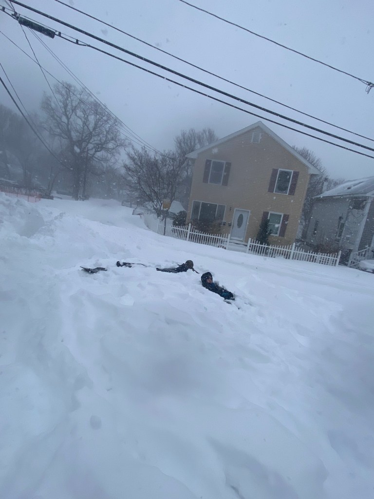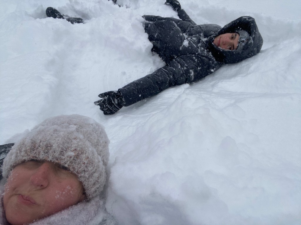 After lunch, we all bundled up to go out. Holy moly was the snow deep. It was too powdery to make a snowman or snowballs. It was really too deep to make a good snow angel as once we fell in, we couldn’t really get up and out, at least I couldn’t. It was really good for jumping from high places and landing in it and it was also good for tunneling through. But the wind continued to whip us, and we just had to go back in with snow sticking to our eyebrows and eye lashes.